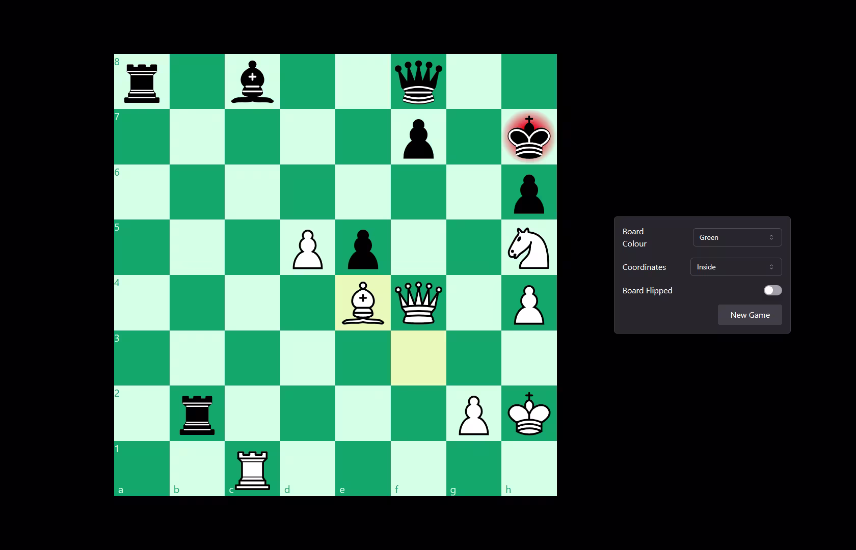 A functioning chess board with all rules in place, and options for board theme and coordinates.